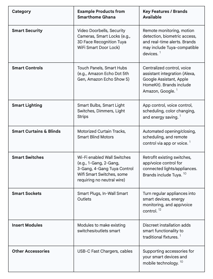 Smarthome Ghana provides a wide array of smart home products across several key categories to help you build a comprehensive and integrated smart living experience. Our selection includes devices from well-known international brands as well as other quality manufacturers, ensuring options for various preferences and budgets.10